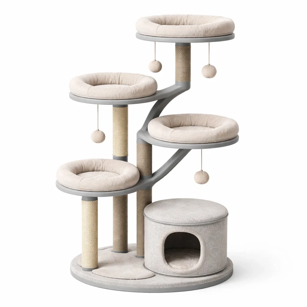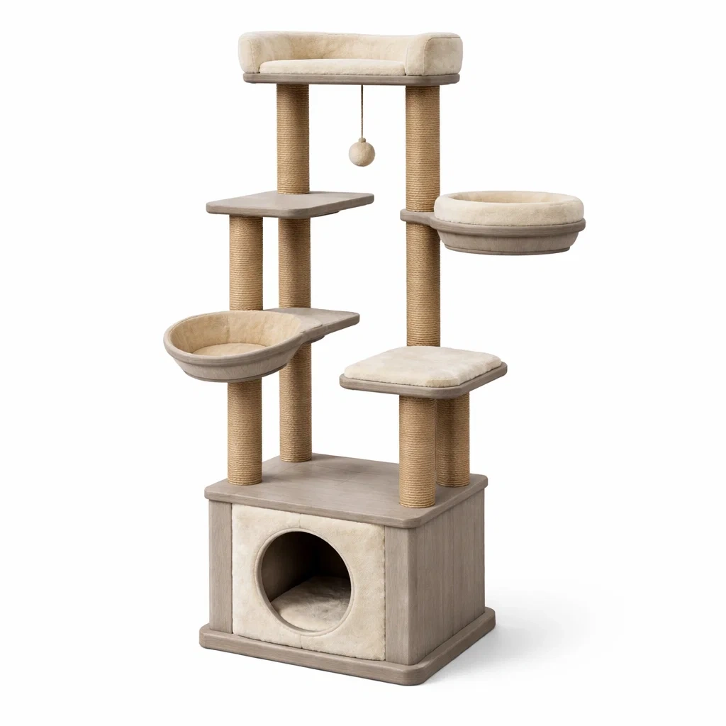 Arbre à chat en bois et sisal beige avec niche et plateformes