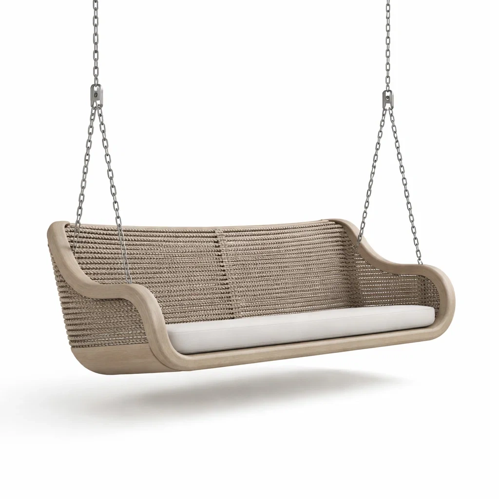Balancelle de porche suspendue en bois avec corde tressée et coussin blanc