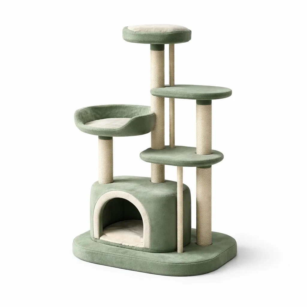 L'arbre à chat est fabriqué en bois avec des poteaux recouverts de sisal, idéal pour que les chats puissent griffer. Les plateformes et la niche sont recouvertes de tissu en polyester. Il mesure 120 cm de hauteur, 60 cm de longueur et 40 cm de largeur. Poids total : 15 kg.